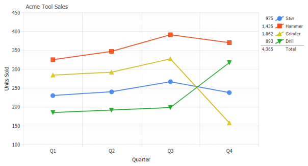 The legend can be positioned anywhere on the chart area and provides interactivity to turn individual series on or off. Using label tokens, legend entries can be easily customized to display general calculations related to their series.