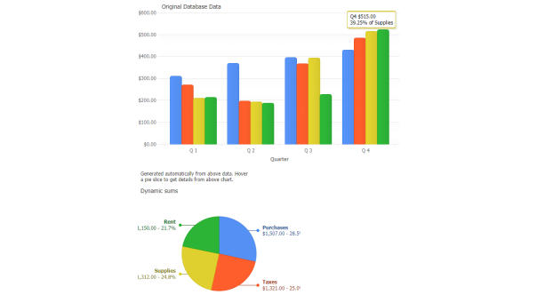 JSCharting includes an advanced PHP DataEngine to simplify connecting your server side MySQL data to your client side JSCharting visuals. In addition to aggregating and passing the data in an compact and efficient format, the DataEngine also facilitates grouping and drill down features.
