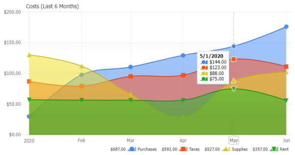 JSCharting supports area lines and area splines in both horizontal and vertical orientations. Charts can be customized to stack or align on the axis with variable transparency to maintain legibility. Advanced arealine and spline feature support includes dynamic negative value styles, empty element handling and marker customization.